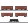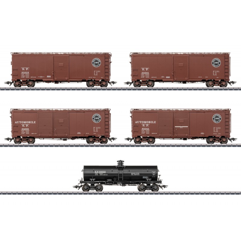 Modèles réels : Ensemble composé de cinq wagons marchandises US de types différents de la Southern Pacific. Deux single-door boxcars, deux double-door boxcars (automotive car) et un tankcar. Etat de service vers 1948.