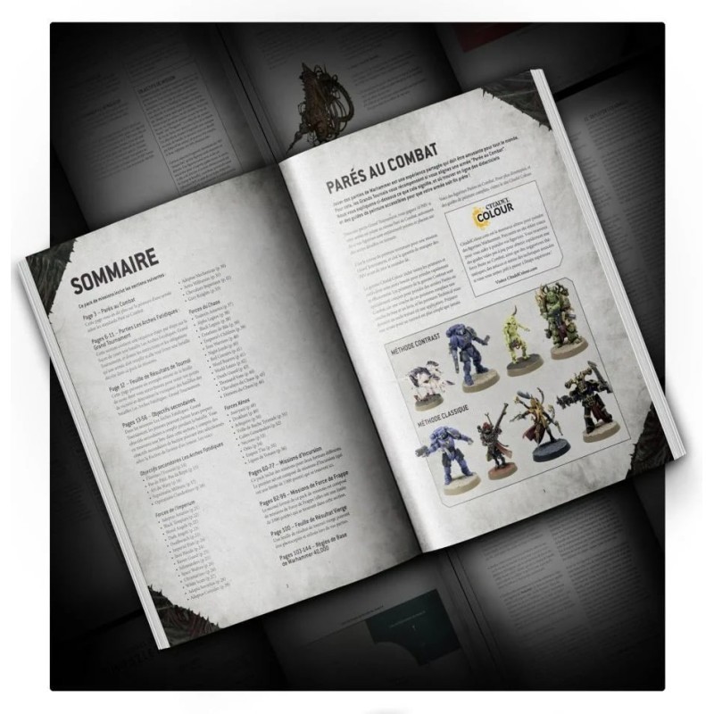 – Les règles de base nécessaires aux parties de jeu égale de Warhammer 40,000, dont un glossaire et une explication des règles rares, ainsi qu'une introduction au standard de peinture Paré au Combat pour peindre vos figurines