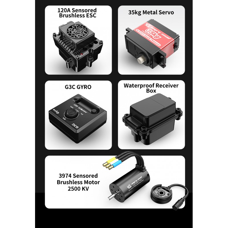 Échelle : 1:7 Vitesse : jusqu'à env. 60 km/h (avec 4S LiPo) Moteur : 3974 Sensored Brushless, env. 2500 KV ESC : 120A indépendant, avec radiateur et ventilateur Servo : 35 kg Poids : env. 4943 g (sans batterie) Dimensions (L×l×H) : 632 × 290 × 237 mm Empattement : 375 mm Largeur de voie : 265 mm Diamètre des pneus : 103 mm Propulsion : 4WD avec différentiels métalliques (avant/centre/arrière) Télécommande : 2.4 GHz, portée 120 m