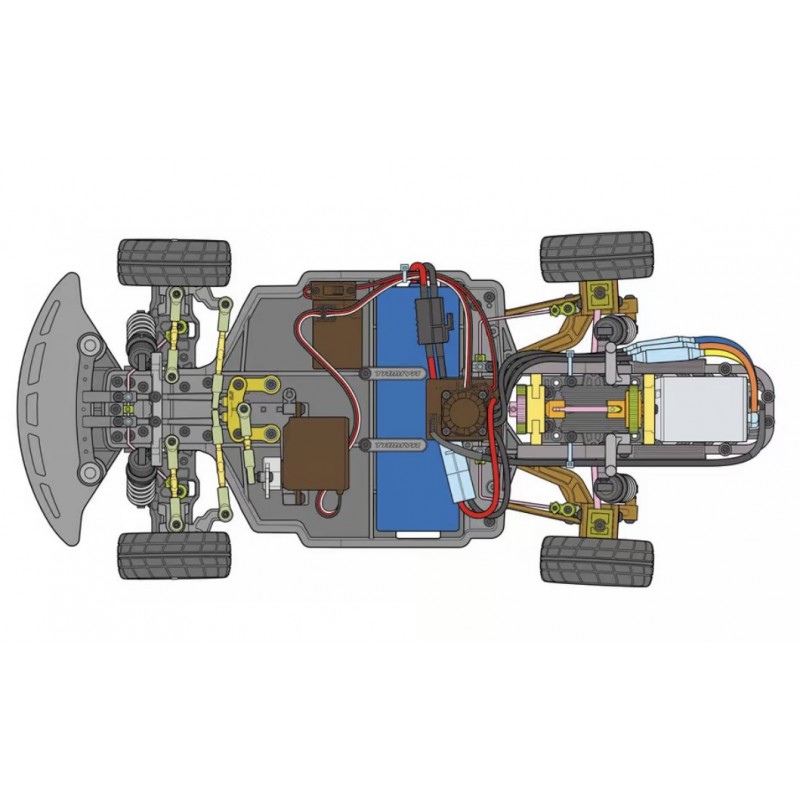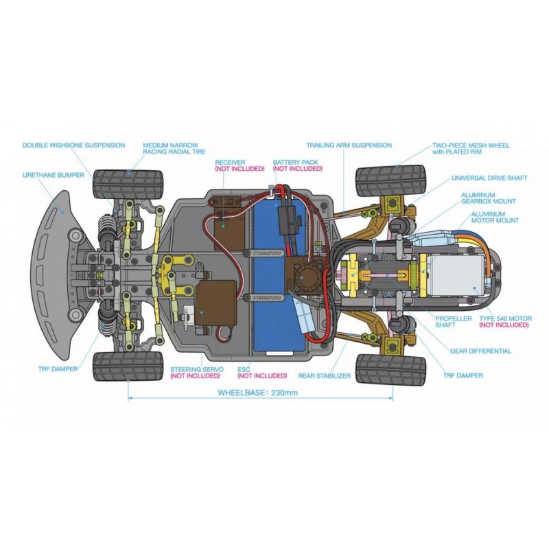 • Kit R/C à monter - Echelle 1/10. Longueur : 435 mm, largeur : 202 mm, hauteur : 130 mm.