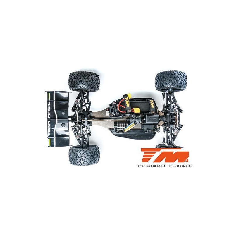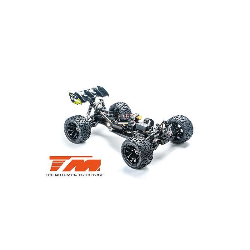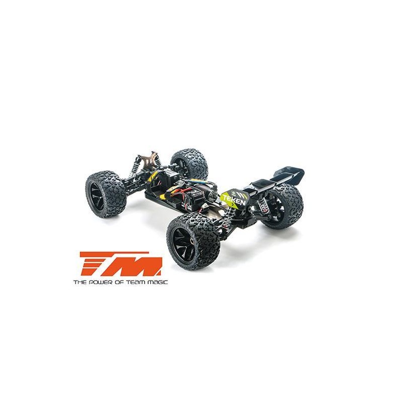 Le truggy TEKEN à transmission intégrale de Team Magic, à l'échelle 1:8 XL, est alimentée par un contrôleur électronique de vitesse étanche de 100A en association avec un moteur haute vitesse de 2500 KV. Un servo en métal à engrenages de 16 kg assure un contrôle de direction puissant. Tous les composants électroniques sont étanches (résistant aux éclaboussures). La plaque de base est en aluminium ultraléger de 3 mm d'épaisseur. Elle comprend trois différentiels équipés d'engrenages coniques usinés par CNC pour absorber les forces et assurer une répartition parfaite de la puissance pour chaque roue. Cela inclut des tours d'amortisseurs en aluminium et des amortisseurs en aluminium. Des raidisseurs de châssis réduisent la torsion indésirable du châssis pendant la conduite. L'empattement, le carrossage et le pincement peuvent être entièrement ajustés avec des tiges filetées. Des pneus haute performance offrent un meilleur contrôle de traction et une durée de vie plus longue. La carrosserie de la truggy TEKEN est en Lexan robuste (polycarbonate) et parfaitement assortie à un grand aileron arrière à forte portance qui aide le véhicule à rester stable en sautant haut dans l'air.