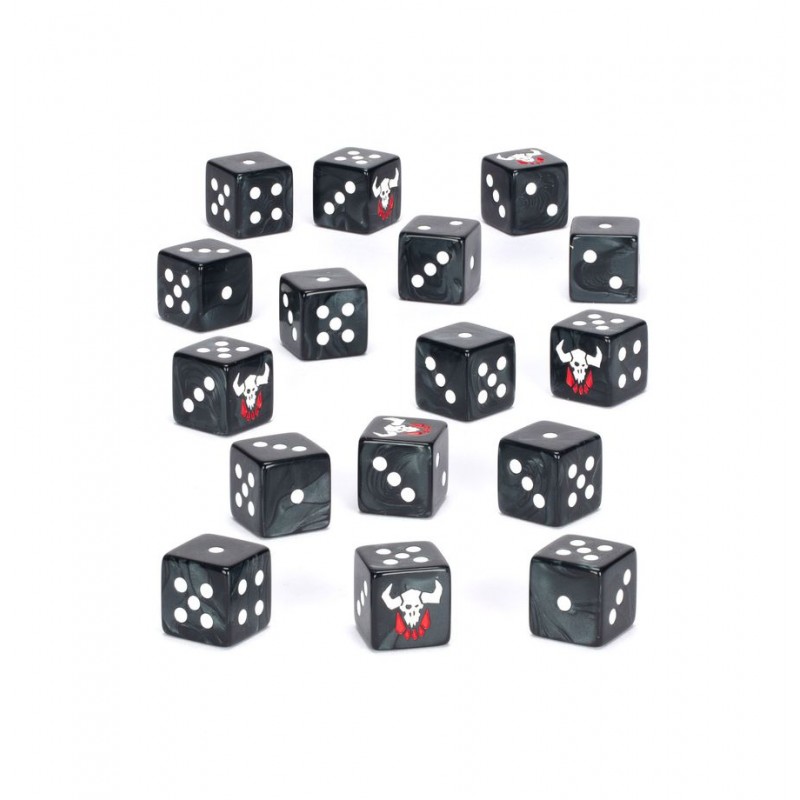 Ce produit est un set de 16 dés à six faces, aux angles carrés, utilisables dans les parties de Warhammer 40,000 et sur le thème de Ghazghkull Thraka. Ils sont moulés en plastique acrylique noir nacré avec des marquages blancs et rouge métallisé, et mesurent 16mm de côté. Les faces 1 à 5 sont numérotées de façon traditionnelle, et chaque face du 6 est ornée de l'icône brutale (mais ruzée) de Ghazghkull Thraka. Ces thématiques sont uniquement disponibles dans la limite des stocks.