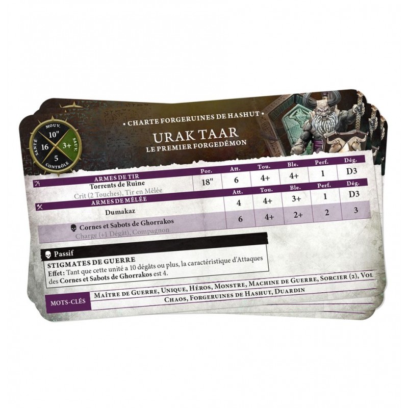 Les Forgeruines de Hashut s'élancent depuis leurs imposantes ziggourats, sous des cieux saturés de nuages de pollution et de flammes. Ces duardins cruels et cupides ont noué un pacte avec un dieu sinistre. Ils sont les maîtres de l'art terrifiant de l'asservissement des démons et emploient l'énergie de ces entités de la ruine pour alimenter leur industrie. Accompagnés par des machines démoniaques aux pas tonitruants, ces osts avancent inexorablement. Armés de lames qui brûlent d'une fureur infernale, ils dépouillent les royaumes de leurs ressources et de leurs richesses, ne laissant dans leur sillage que des désolations calcinées.